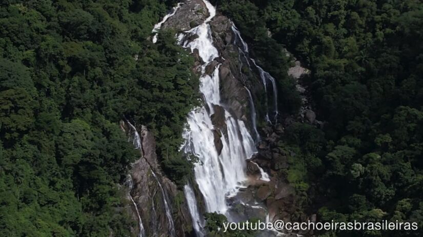 Cachoeira Véu da Noiva. Foto: Reprodução/YoutubePor que ir: queda de ≈80 m no Parque Ecológico do Perequê, uma cachoeira clássica perto da Capital.